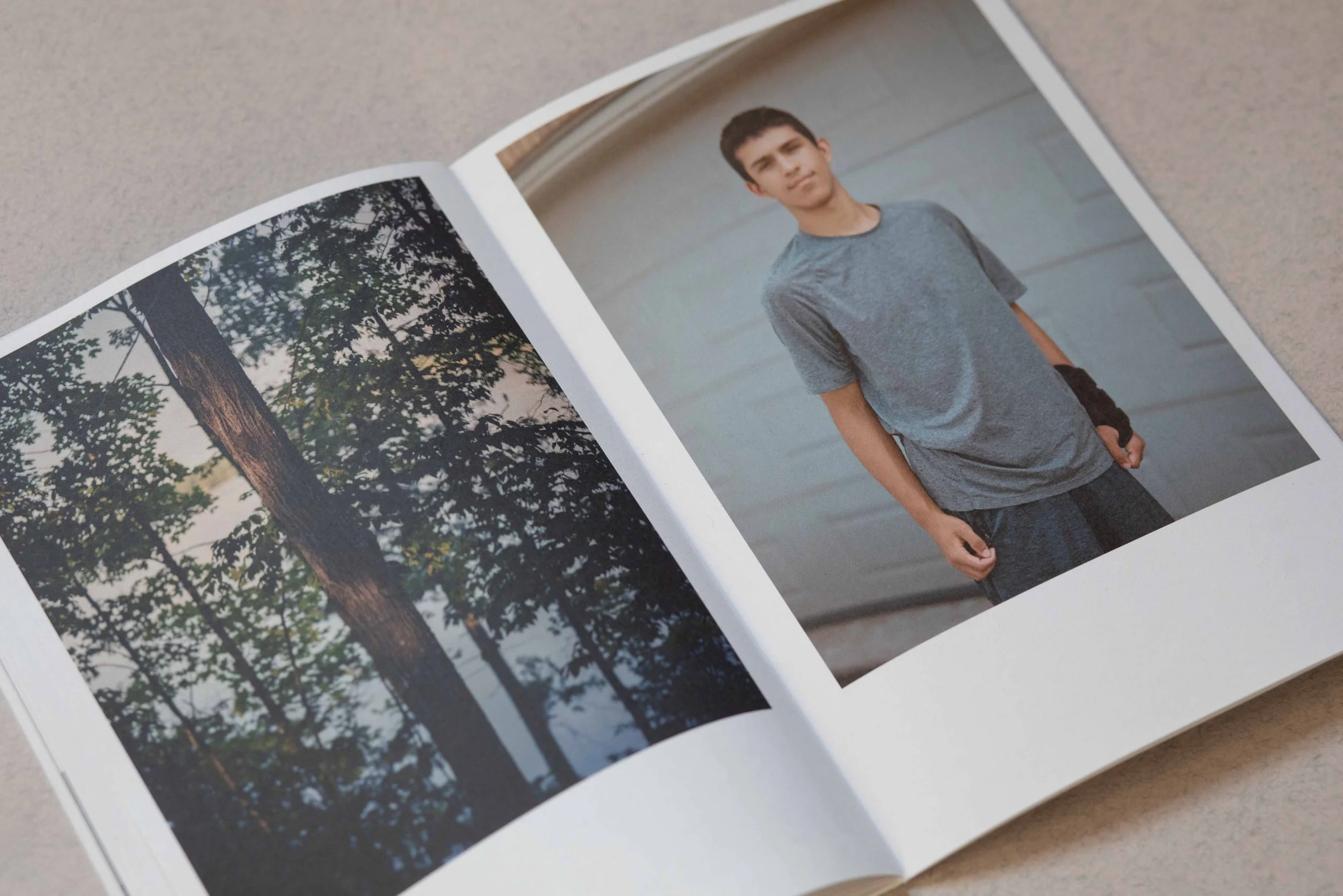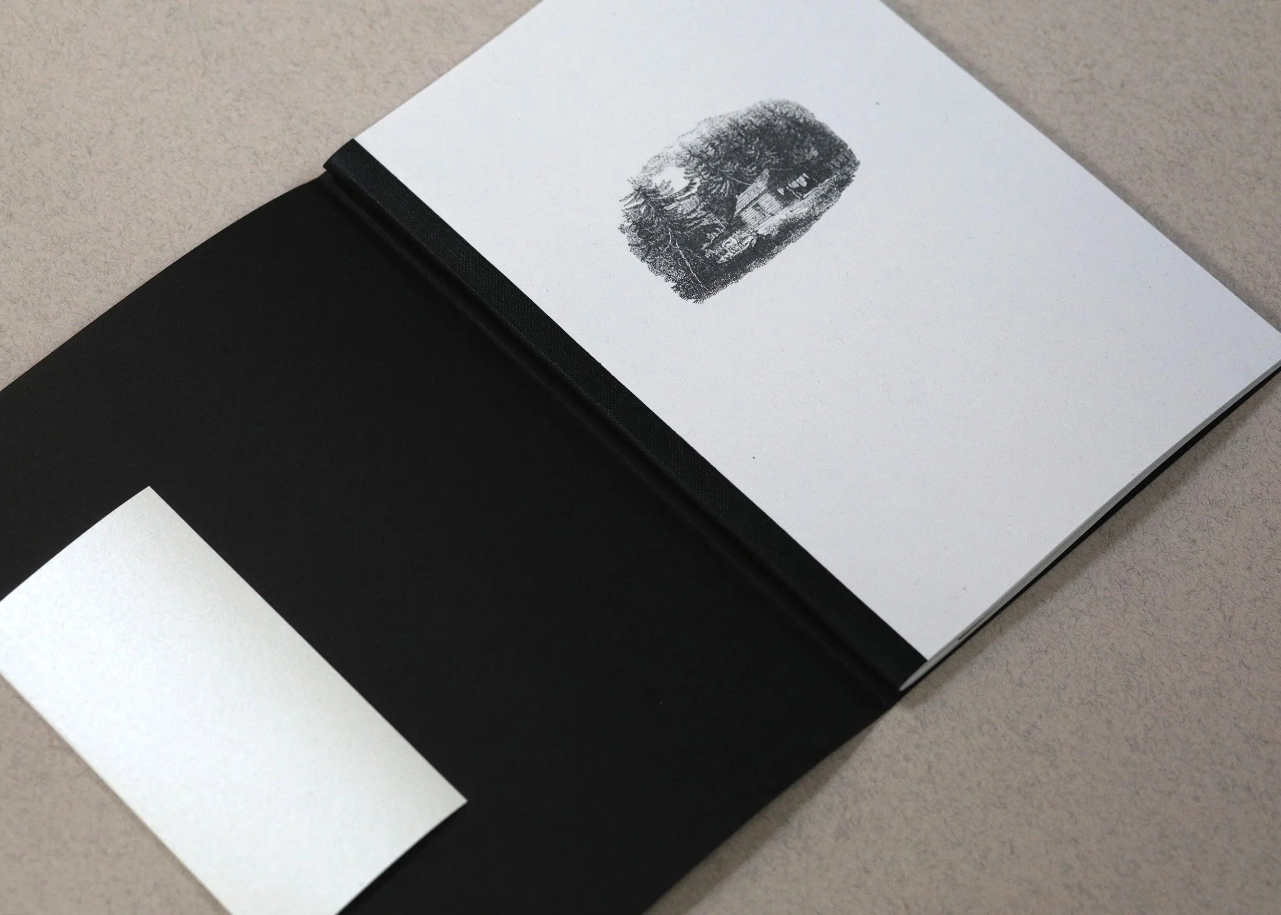 52pp / 120gsm Uncoated natural / Saddle stitched / cloth tape / Swiss bound soft cover / Black textured card